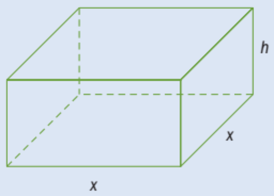 A closed box with a square base has a total surface area of 36m2. Find the maximum possible volume of the box: