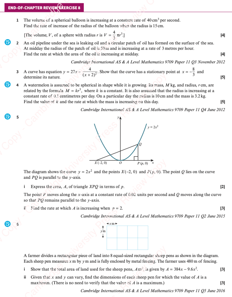 3.) The surface area of a cube is increasing at 0.3m2s-1. Find the rate of increase of the volume of the cube when the length of the side is 5m.