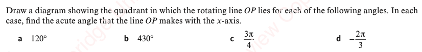 In order to calculate trigonometric values of angles greater than 90 degrees we must measure the angle in a standard way. We measure it anticlockwise from the line OX. Depending on the size of the angle we say it is in Quadrant I, Quadrant II, Quadrant II or Quadrant IV.