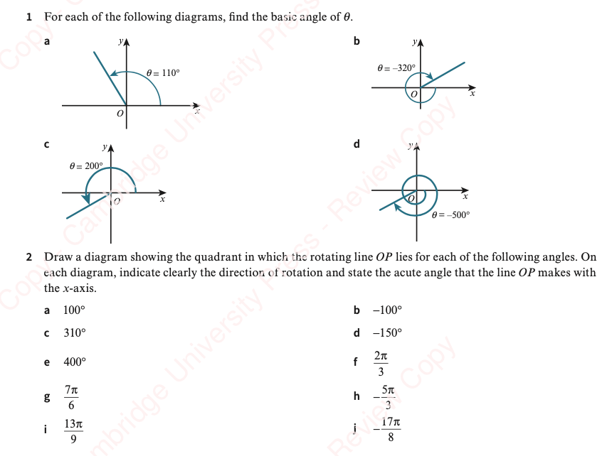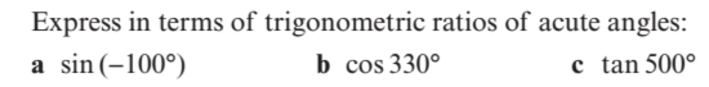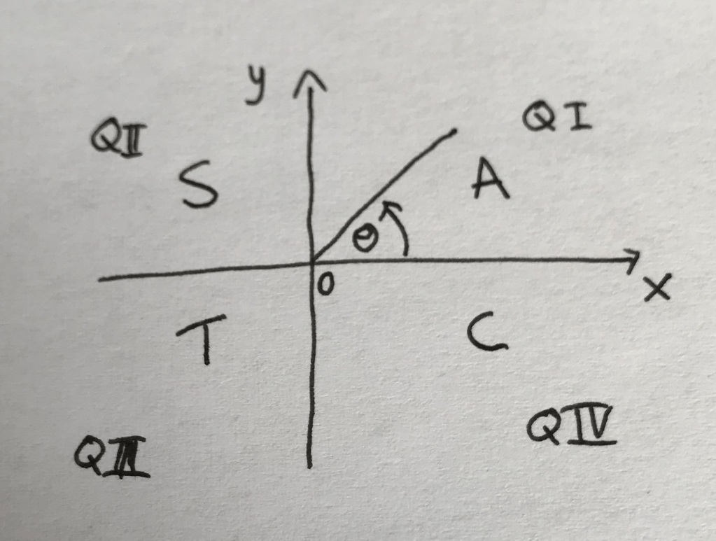 It is useful to remember the sign (i.e. + or -) of each of the trigonometric ratios in each quadrant. Then to calculate a trigonometric ratio, we can calculate the basic angle (angle from x) and then use the quadrant to determine the sign.