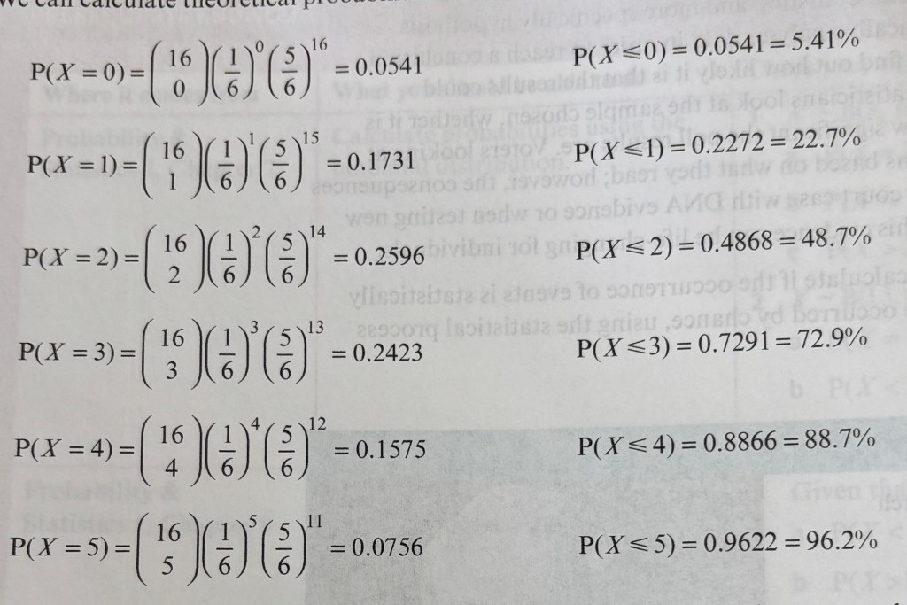 Let’s start by considering how many 3s we would expect to see if we rolled a dice 16 times. The number clearly is between 0 and 16 and we can calculate the the theoretical probability for each of these, as we have a binomial distribution with n=16 and p=1/6.