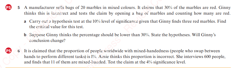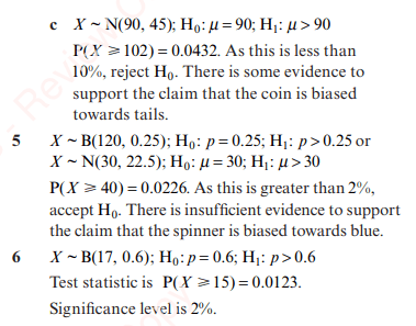 A fair pentagonal spinner can land on red, blue, black, orange or green colours. It is spun ten times and lands on red five times. Test at the 4% level of significance if the spinner is biased towards red.