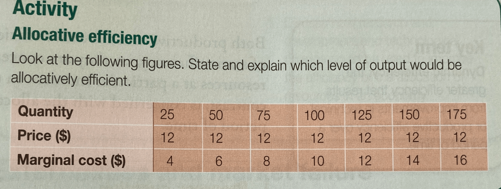 Allocative efficiency is achieved when a society is producing an appropriate bundle of goods relative to consumer preferences. Market forces tend towards a position where from the consumers’ perspective the price is equal to the marginal benefit received from consuming the good and from the firms’ perspective the price is equal to the marginal cost of producing the good. We need to consider for each market though, whether this situation is always achieved.