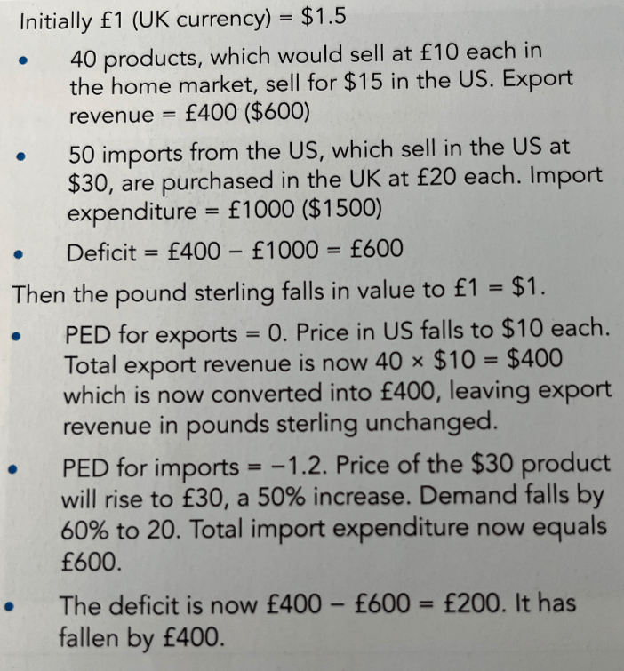A larger combined PED for exports and imports will mean that less of a fall in the exchange rate will be required to improve the current account position. If the combined PED is less than 1, then a revaluation of the exchange rate would be a more suitable strategy.