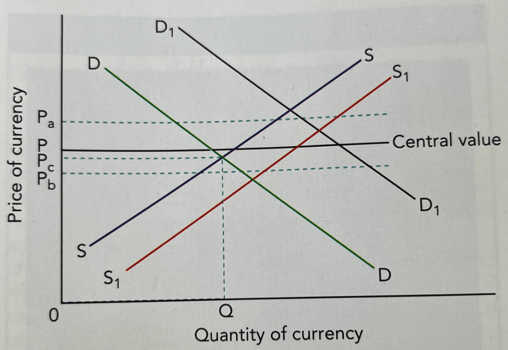 If the exchange rate remains within the limits (e.g. at Pc), no action is taken. If demand were to rise to D1, then the central bank would sell domestic currency to increase supply to S1, keeping it within the limits.