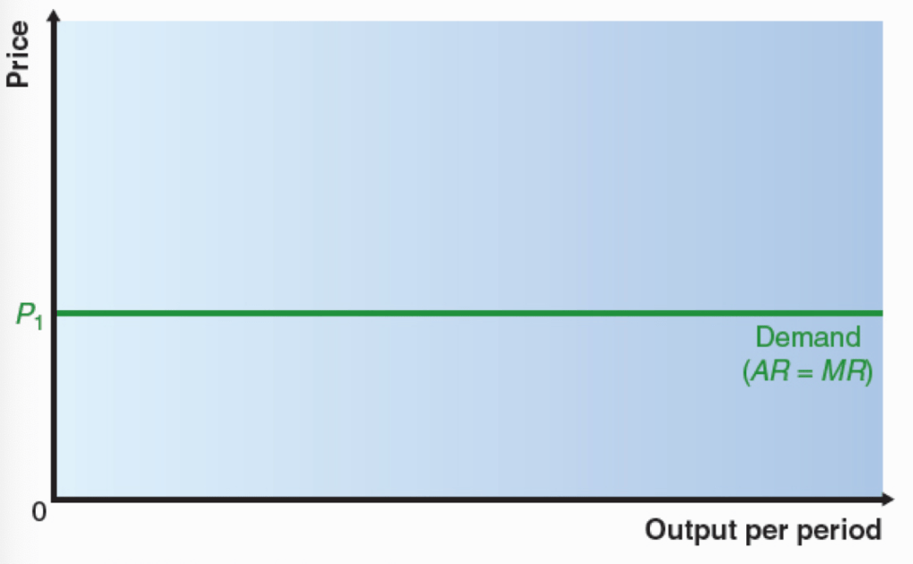 Under the following assumptions, we can analyse how a firm will operate in a market. In these conditions an individual cannot influence the price, i.e. they are a price taker and face a perfectly elastic demand curve for their product, as shown below. If they raise their price, they will sell nothing, and they have no incentive to decrease their price as there are no limits to the amount they can sell at the equilibrium price.
