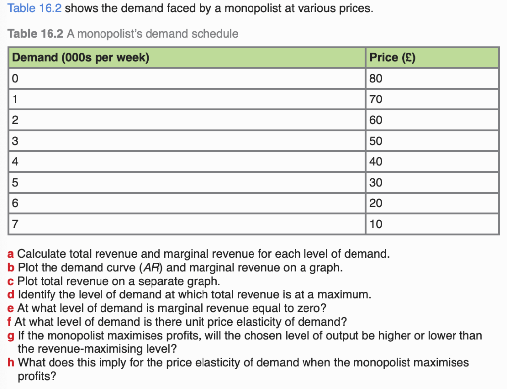 A monopoly firm faces the demand curve directly, so their demand curve is not horizontal, but slopes downwards and shows average revenue. As well as making decisions about output they can make decisions about price, although they are constrained by market demand. Below is a reminder of the level of elasticity at different points on the demand curve: