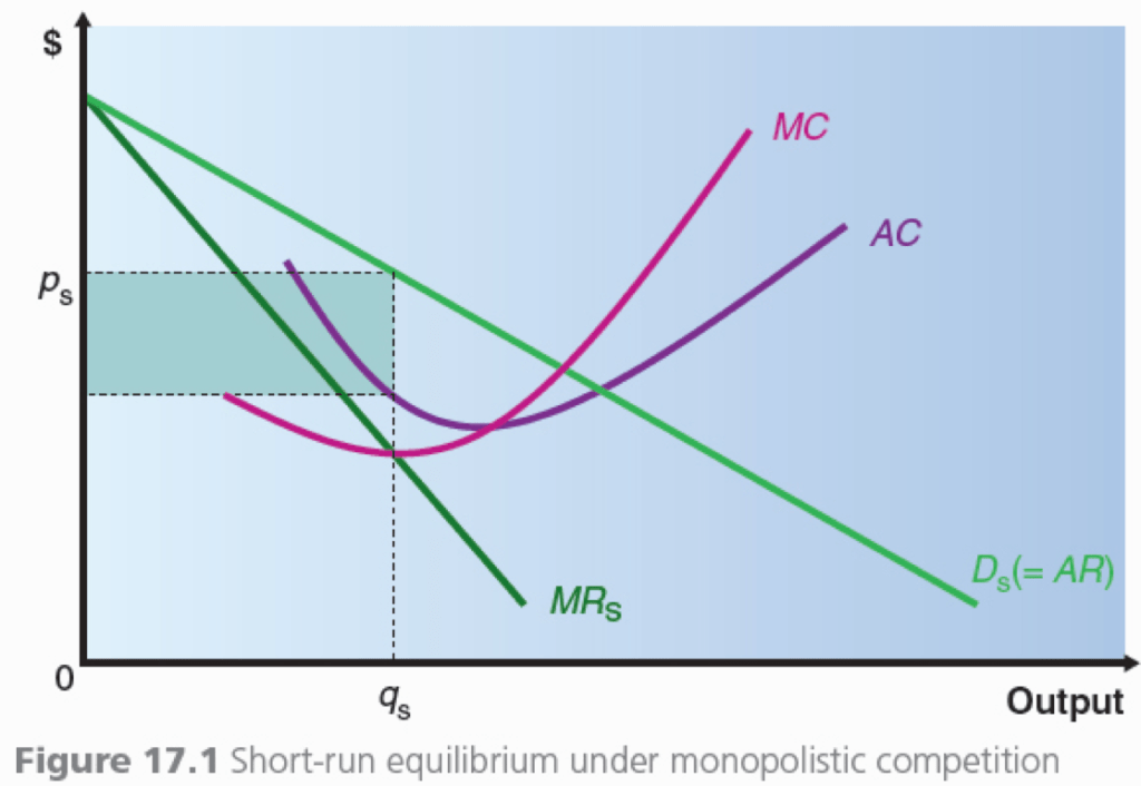 The MC and AC curves represent costs for a typical firm in the industry. To maximise revenue, they will produce a level of output where MRS=MC. As we see in the shaded area above, setting the price at this point leads to some supernormal profits, similar to what we saw with a monopoly.
