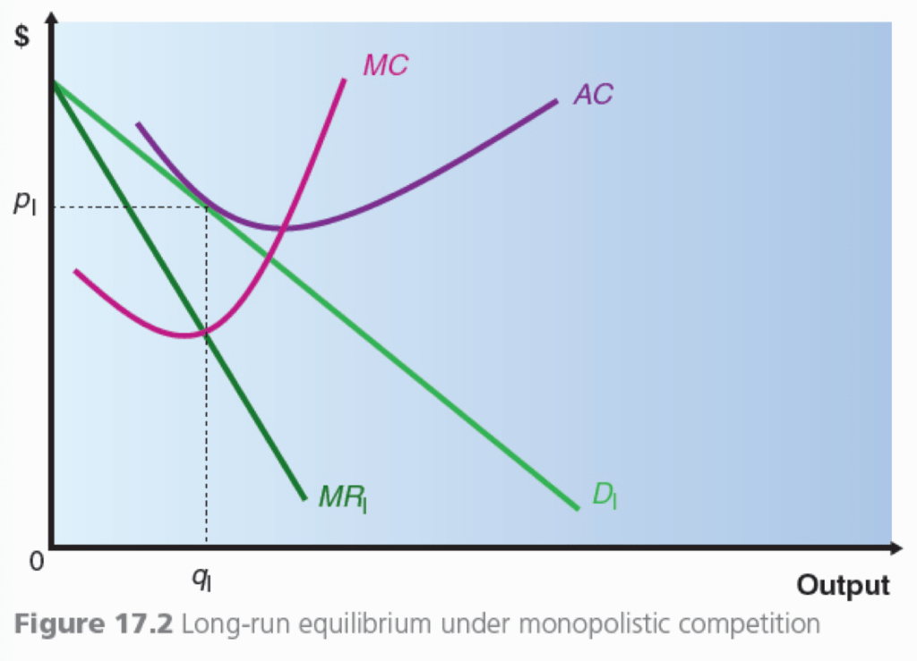Here we see that at the price point where marginal revenue is equal to marginal costs, the average costs curve is tangent to the demand curve, meaning that average costs are equal to average revenue and so the firm is making normal profits (just covering their opportunity costs), which takes away the incentive for more firms to join the market.