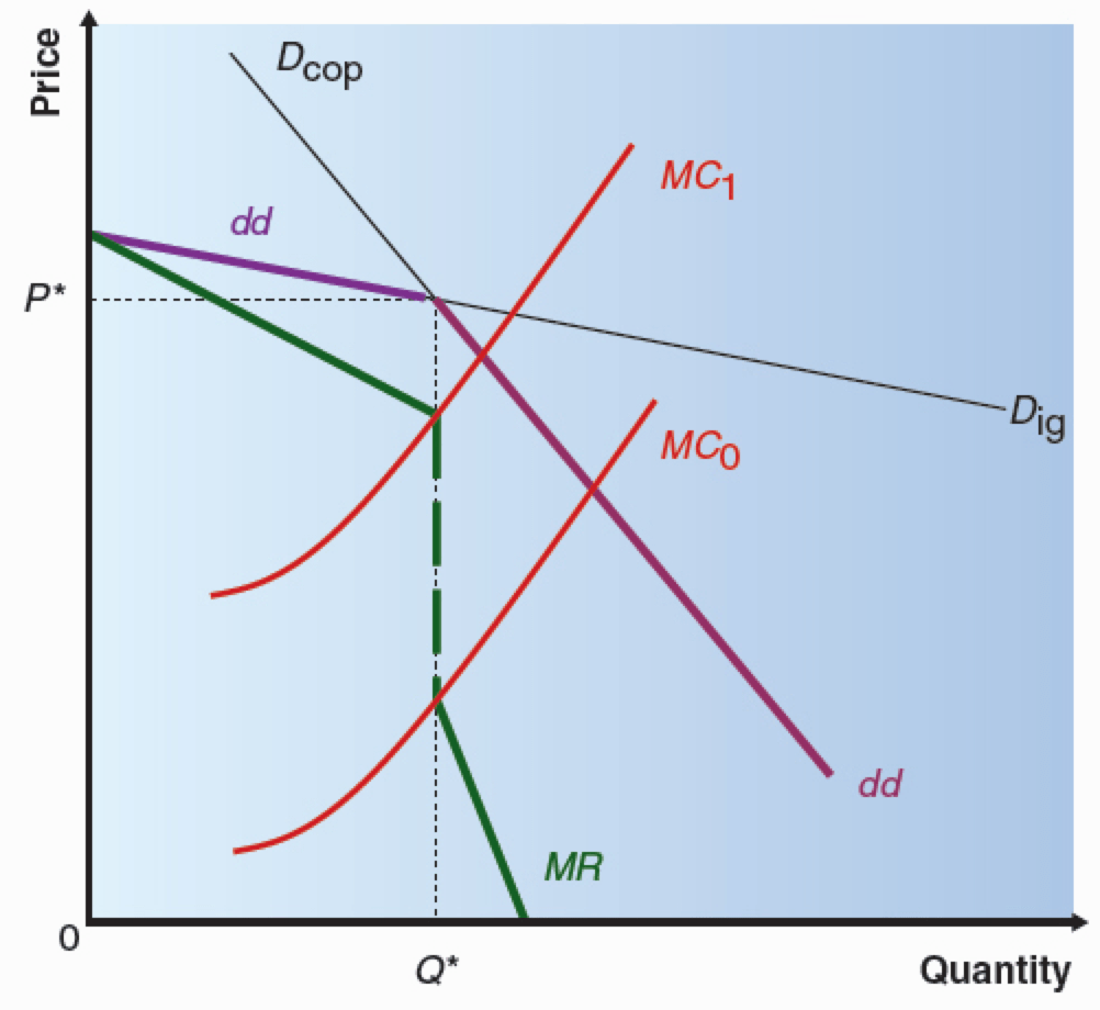 Suppose that a firm is currently selling quantity Q* at price P*. Their problem is that they only know about that on point on the demand curve. Dig shows the demand curve if other firms ignore a price change by them and Dcop shows the demand curve if other firms will copy a price change by them. The firm may consider that rivals will ignore a price increase (as this won’t threaten their market share), but copy a price decrease (as this would threaten their market share), which would lead to a kinked demand curve, as shown by purple line dd.