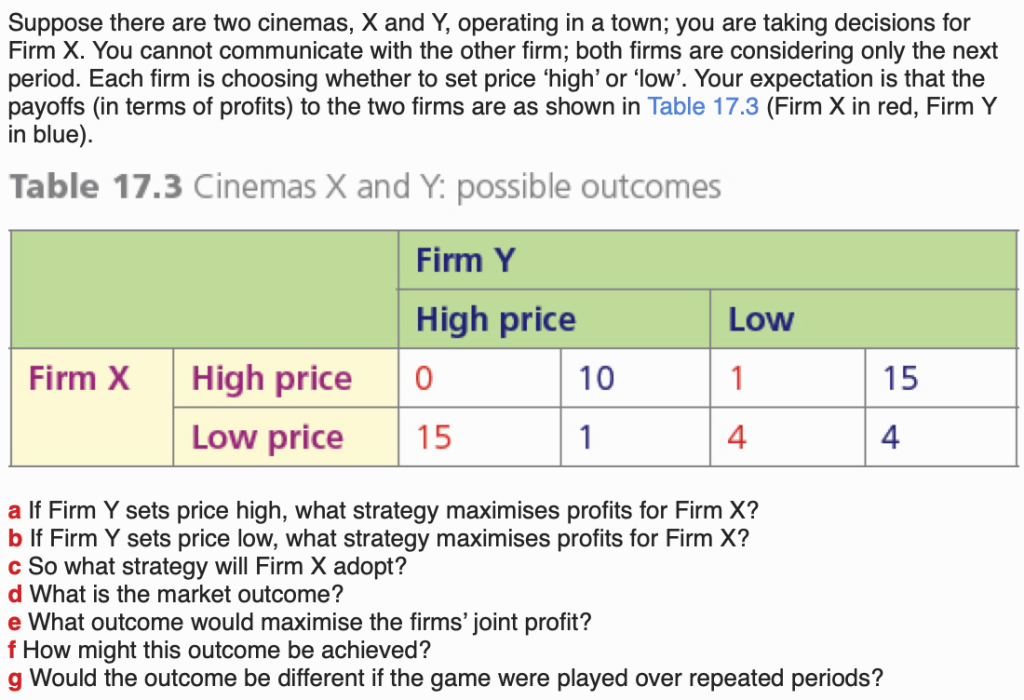 In reality, “games” are of course much more complicated, and there are also non-pricing strategies that companies can use (e.g. in the airline market offering additional leg room or greater baggage allowances), and games are not typically zero-sum, like the ones considered here (i.e. a gain for one firm doesn’t necessarily mean a loss for another). Game theory also assumes “rational economic behaviour” and doesn’t take into account behavioural economics.