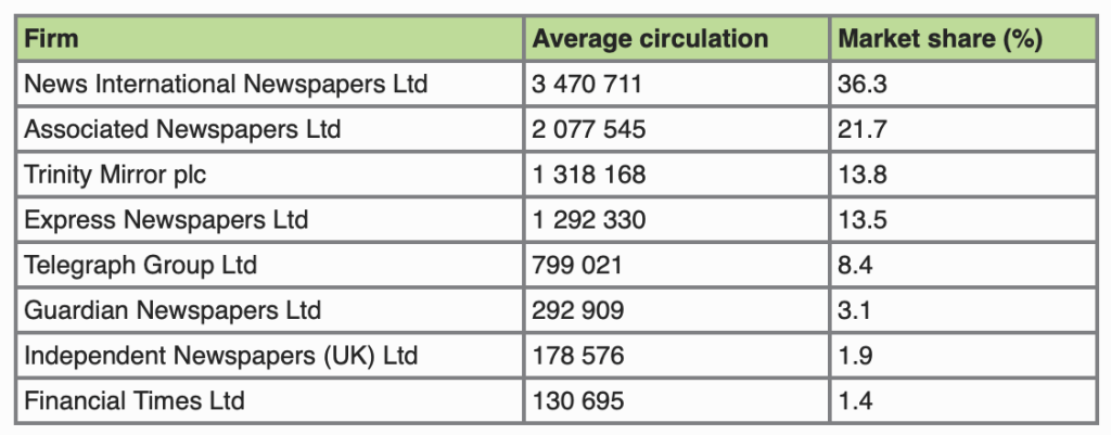 In this example, the 3-firm concentration ratio is 71.8%. Sometimes a more granular approach is needed though, as we could argue that the Sun (part of News International) and the Financial Times are not really part of the same market.