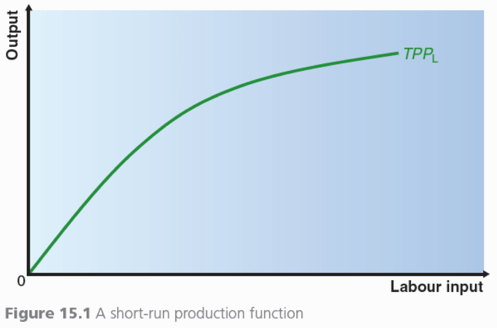 In general, if a firm increases the quantity of labour (the variable factor) employed, whilst holding constant the input of the other factors, it will eventually get diminishing marginal returns from the variable factor, an effect known as the Law of Diminishing Returns. This is demonstrated on the graph below, which shows total physical product (TPPL) as labour input is increased: