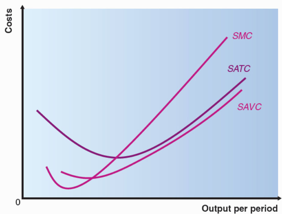 Below we compare short-run average costs, SATC, with short-run marginal costs, SMS, and short-run average variable costs, SAVC. Average fixed costs along will slope downwards throughout, as in the short run the total fixed costs is not increasing, but the output over which the average is divided is increasing. Notice that the marginal curve cuts both the average curves at their minimum points, as if the marginal cost is greater than the average cost, this will always cause an increase in the average cost (another way of saying this is that SATC and SAVC must always tend towards SMC):