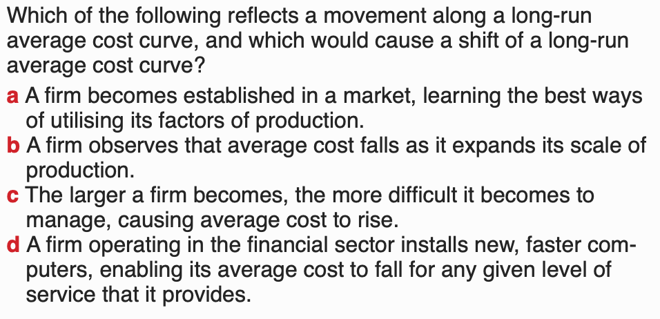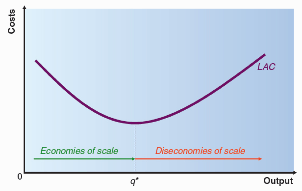 Below we show how economies of scale can impact a long-run average cost curve. An output level of q* is known constant returns to scale, found when average cost remains constant with an increase in output (we can also say that prior to this there were increasing returns to scale and after this there are decreasing returns to scale.