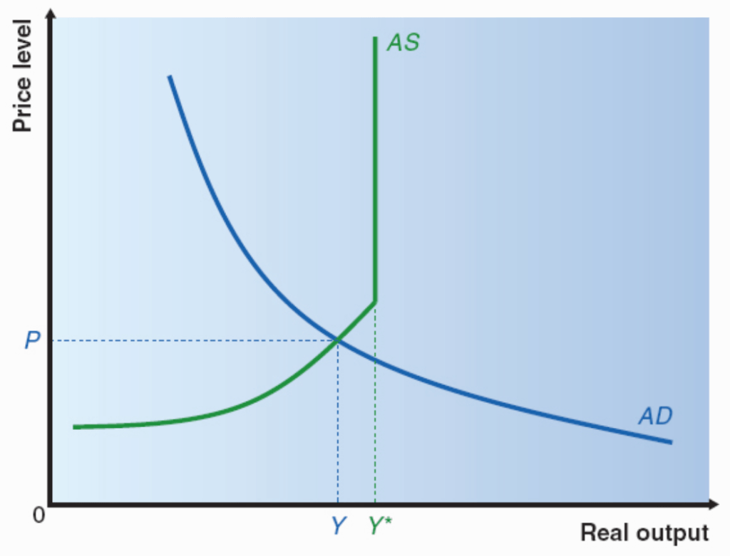 For instance, an increase in government expenditure can shift the aggregate demand curve, as shown below. However due to the increasing steepness of the supply curve, further shifts to the demand curve will lead to increases in the price level, without commensurate increases in real output (elasticity of supply reduces).