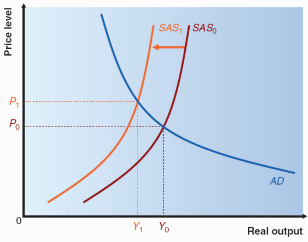 An external shock may affect aggregate supply, for instance a disaster in the Middle East could lead to an increase in oil prices, raising firms’ costs and leading to a reduction in aggregate supply, as shown below:
