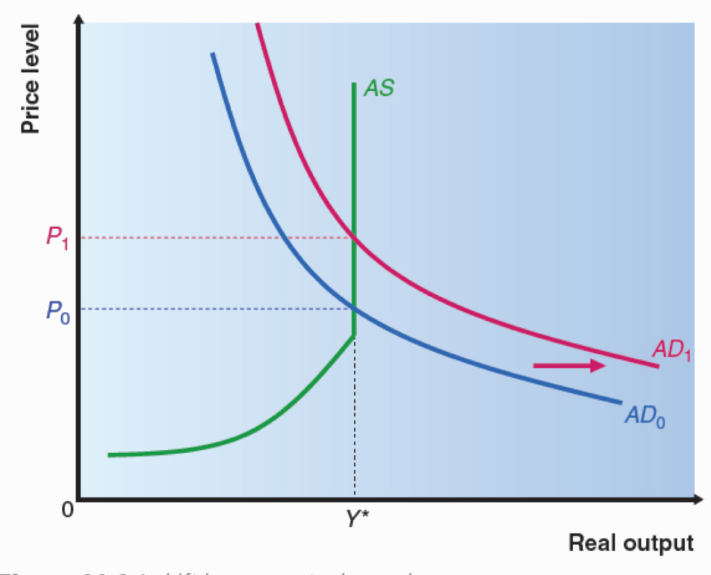 Now let’s look below at the impact of an increase in aggregate demand. As you see, price increases without an increase in output. Moreover, if this shift is caused by an increase in government expenditure, financed by an increase in money supply, the AD curve can continue to move to the right, causing not just a move to a new macroeconomic equilibrium, but inflation.