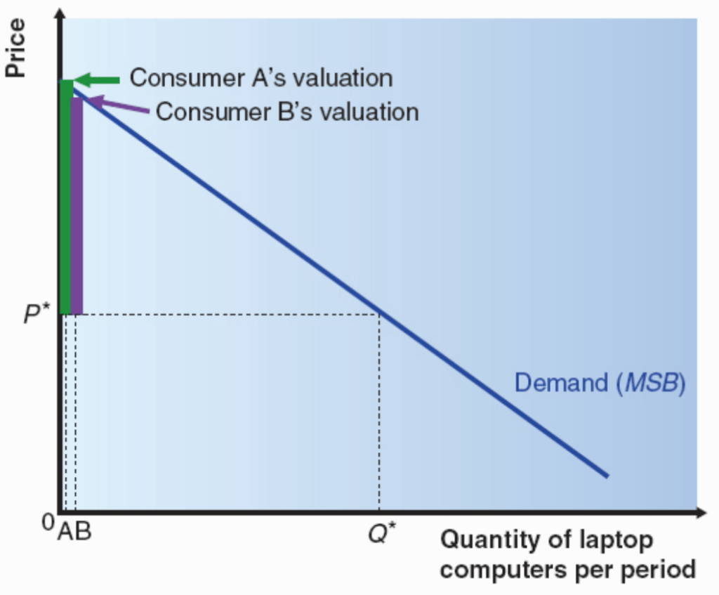 The price of a good serves as an indicator of consumers’ preference within a market. One way we can think of this is to consider the marginal consumer. This consumer would choose not to buy if the price were even slightly above the equilibrium price P*. If we think about society as a whole, P* can be considered as the marginal social benefit (MSB) from consuming the good.