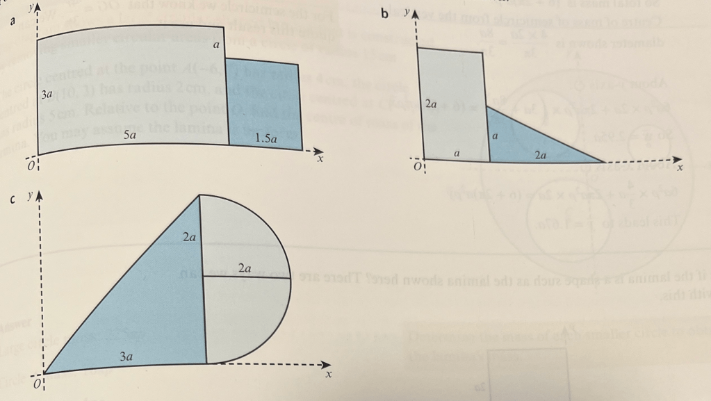 Calculate the centre of mass of each of the below composite shapes relative to the axes shown: