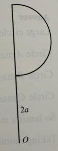 A letter P is constructed using a uniform straight piece of wire of length 4a joined to another piece of uniform wire bent into a semicircle of radius a. If the semicircular piece of wire is three times as dense as the straight wire, then find the position of the centre of mass relative to point O.