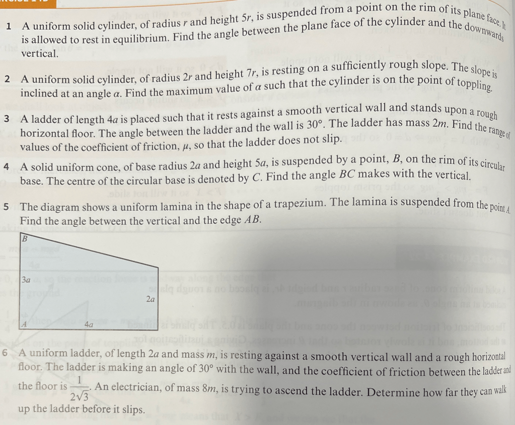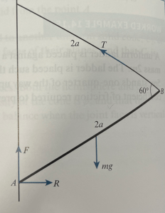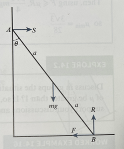 Taking moments clockwise around B gives: S x 2acos𝜽 = mg x asin𝜽. So using sin𝜽 = 3/5 and cos𝜽 = 4/5, we have and since F=S,