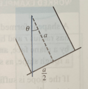 Notice that there is a small triangle that we can use to calculate the angle which will cause the block to topple, illustrated below. So the minimum angle for toppling is tan𝜽 = = ½, so the block topples when 𝜽 is 26.6°.