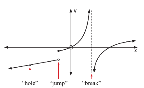 Regarding discontinuities, we can distinguish between a hole, a jump and a break.