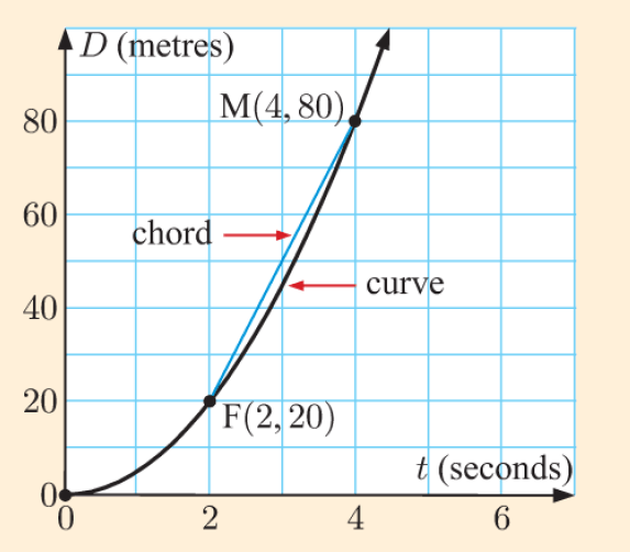 Consider a fixed point, F, on the curve when t = 2 seconds. We can choose another point M and draw the line segment (or chord) between the two points.