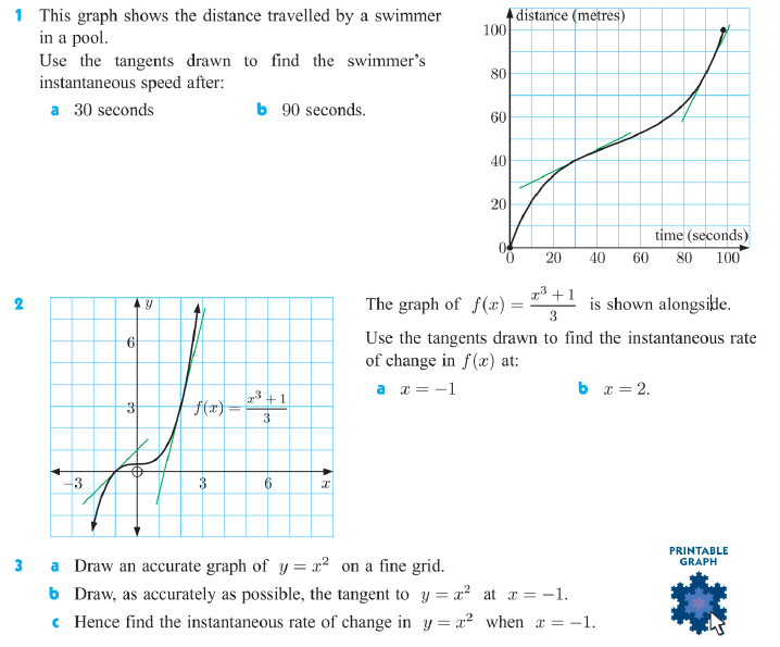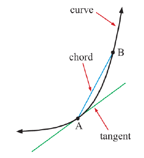 From the investigation and referring to the diagram above, we notice that as the chord from a fixed point gets shorter, the average rate of change between the two endpoints of the chord approaches the instantaneous rate of change. Graphically, the chord (and its corresponding gradient) gets closer to being the tangent (and its gradient).