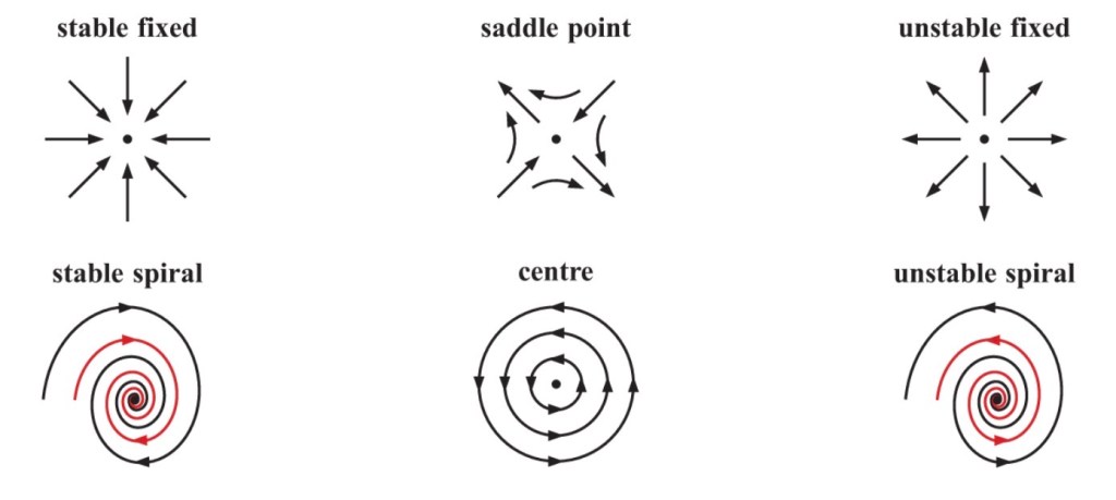 Equilibrium points can be classified according to the behaviour of the phase portrait around them, as illustrated below: