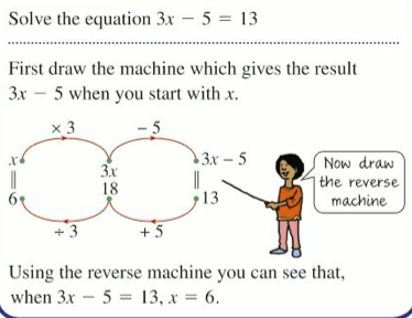One way to think about solving equations is to think of equations as a function machine and then create the reverse function machine to solve the equation, as shown in the following example: