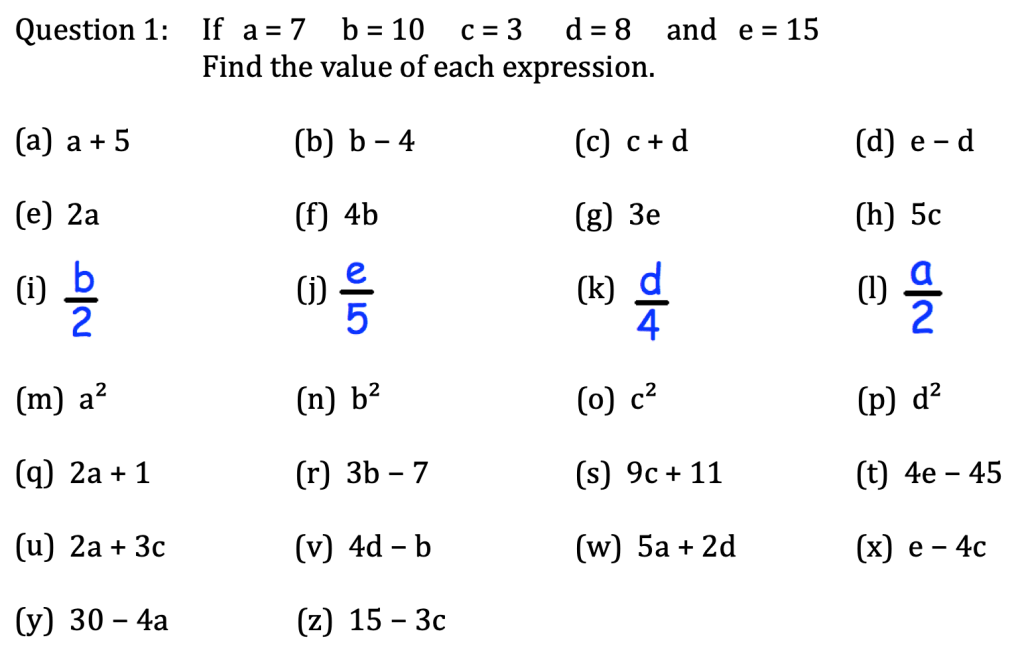 If we have an algebraic expression, such as 2x-3 and we are told the value of the unknown, e.g. x=7, then we can evaluate the expression, that is, find its value, by substituting the value of the unknown into the expression. What will the value be in this case?