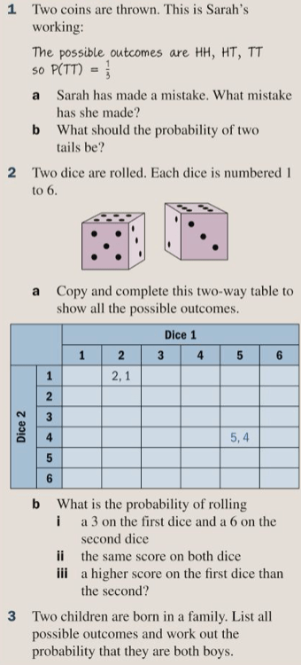 Let’s consider tossing a coin and rolling a dice and draw a table to show all the possible outcomes that can occur. As each of these outcomes are mutually exclusive, each outcome has an equal probability of occurring. So what is the probability of getting a Head and a 6? What is the probability of getting a tail and an even number?