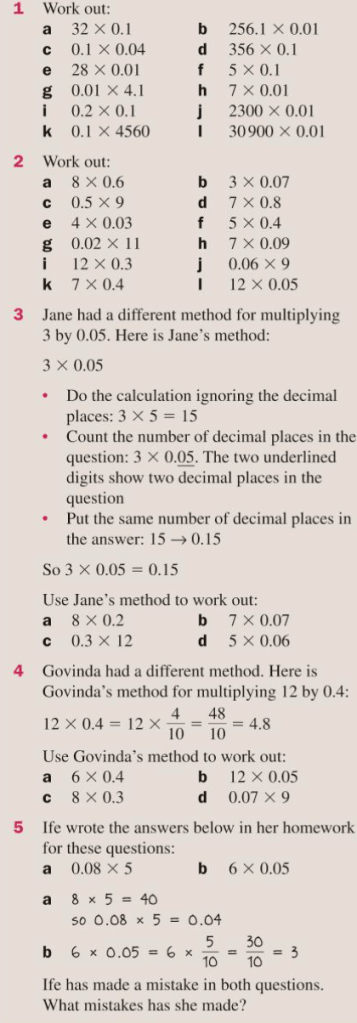 Multiplying by decimals is made easier if we remember that 0.1 = 1/10 and 0.01 = 1/100 (and 0.001 = 1/1000, etc.)