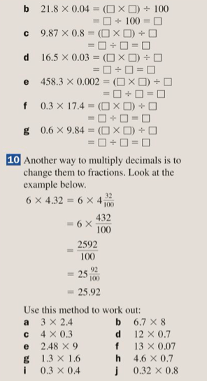 Multiplying decimals by decimals is effectively the same. So if we want to calculate 0.7 x 0.08, we can rewrite it as 7 x 0.1 x 8 x 0.01.
