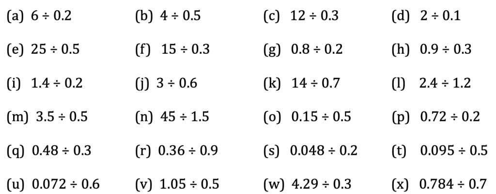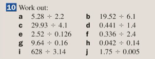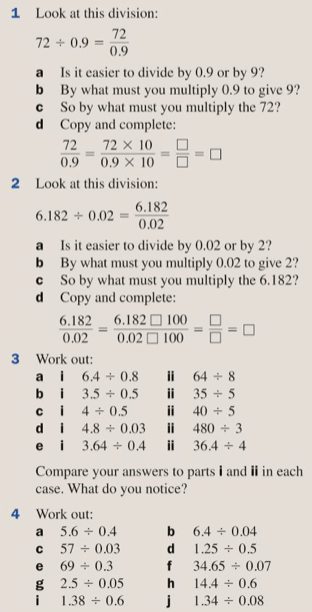 So, for instance, if we need to calculate 0.3 ÷ 0.015, we can multiply both of our numbers by 1000 to give 300 ÷ 15 = 20.