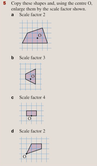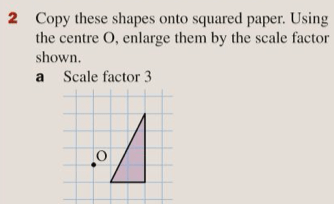 To “do” an enlargement from a given centre, we draw a continued line from the centre to each of the vertices and then mark a point “n” times further along that line, where n is our scale factor. Again, let’s try this first with a drawing.