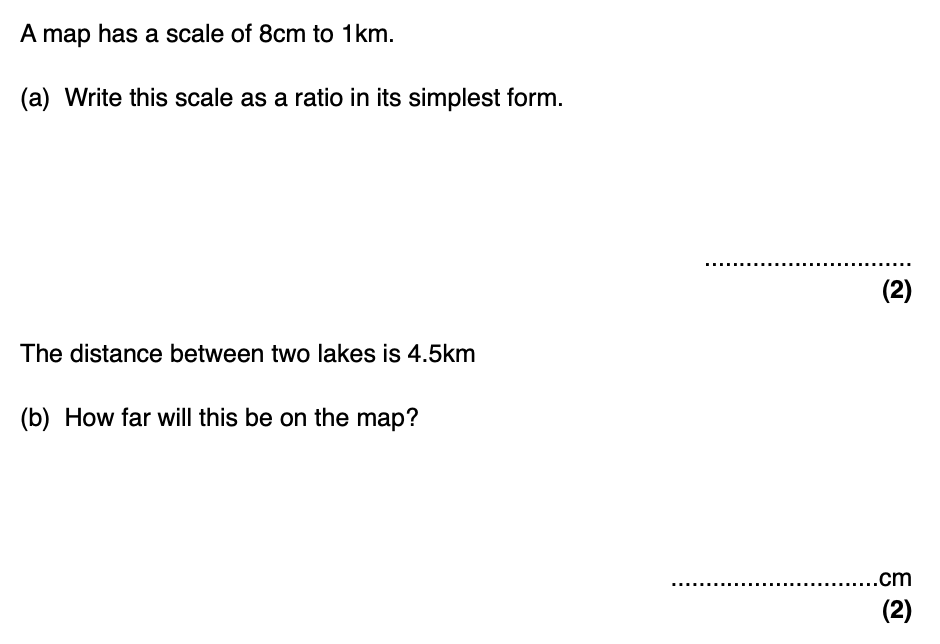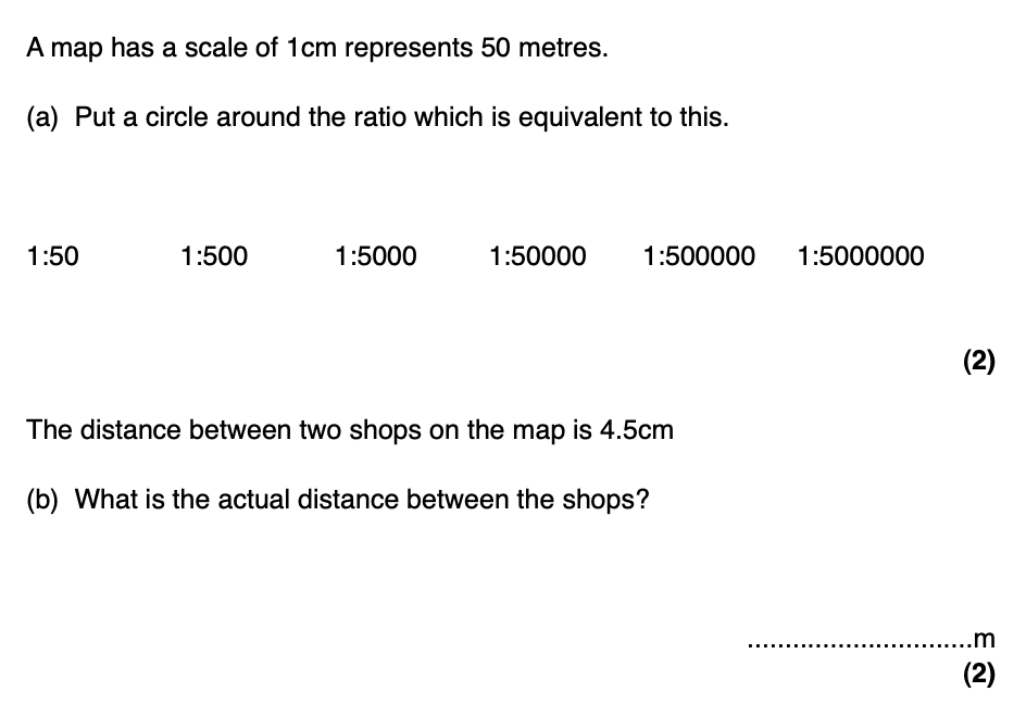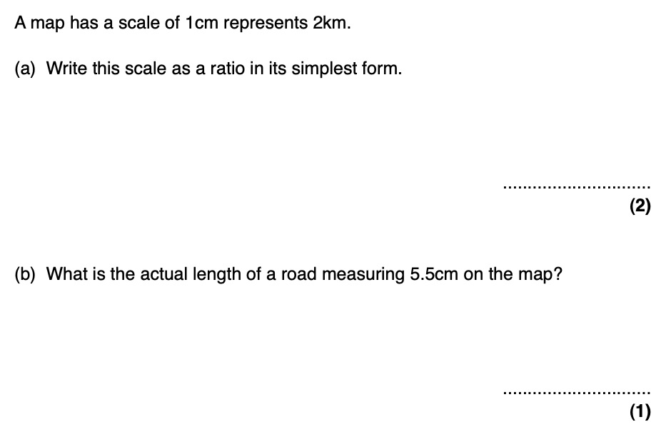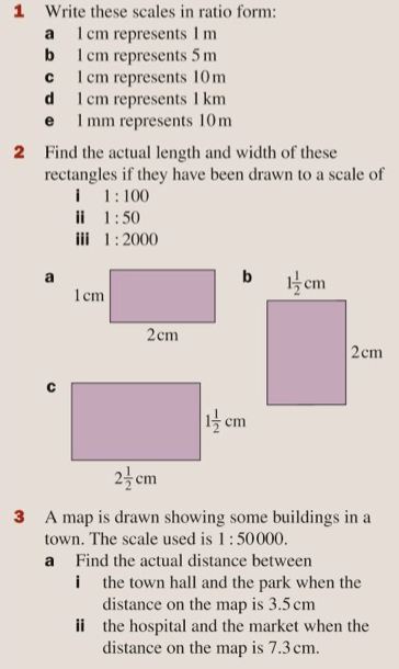 It is often useful to write a scale without any units in it. For instance, because 1m=100cm, if we have a scale of 1cm to represent 2m, we can write this as: