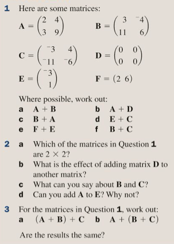 Let’s try some examples of both. When we are multiplying a matrix by a matrix we will have lots of little multiplications to do – the important thing is that we do them in the right order. The teacher will demonstrate this on the board with some examples.