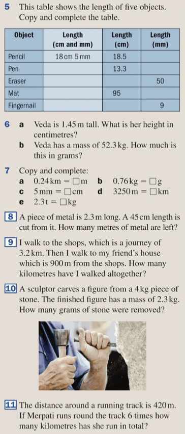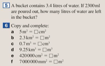 Which units do we know for these? Let’s list them out and try some conversions with the teacher. It is important to remember that the conversions with area and volume are significantly different from those with length.