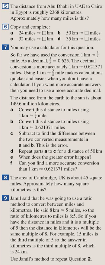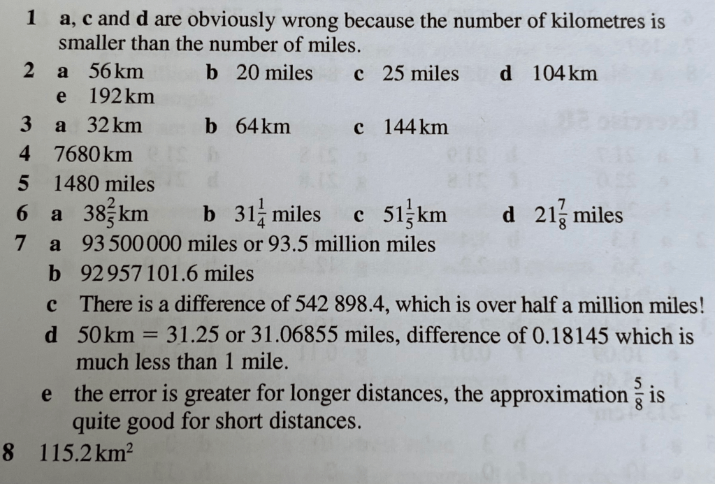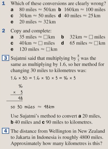 Converting between miles and kilometres is easy enough. We just have to remember that 1km is 5/8 of a mile. Another way to say this is to say that 5 miles = 8km. Let’s try converting some distances.