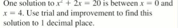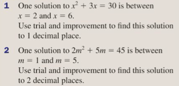 The trial and improvement method we use is to try a value for “x”. If the result is too large we try a smaller value and if the result is too small we try a larger value. Carrying on like this we can calculate the value to whatever degree of accuracy we require. (Although this may seem like a kind of guessing, it is actually part of a very important topic within mathematics that is studied at university and beyond, know as numerical analysis).