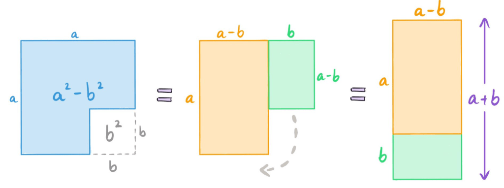 We have a special formula that we can use if we want to factorise the difference of two squares. We show it below with a diagram to show its geometrical interpretation: