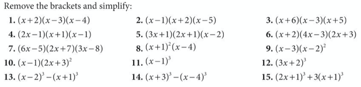 Below are some more advanced questions from the “extended” book. The principle is the same, just some of our brackets are now “squared” and some questions have three brackets. Where there are three brackets, deal with two of them first, and then deal with the remaining one.
