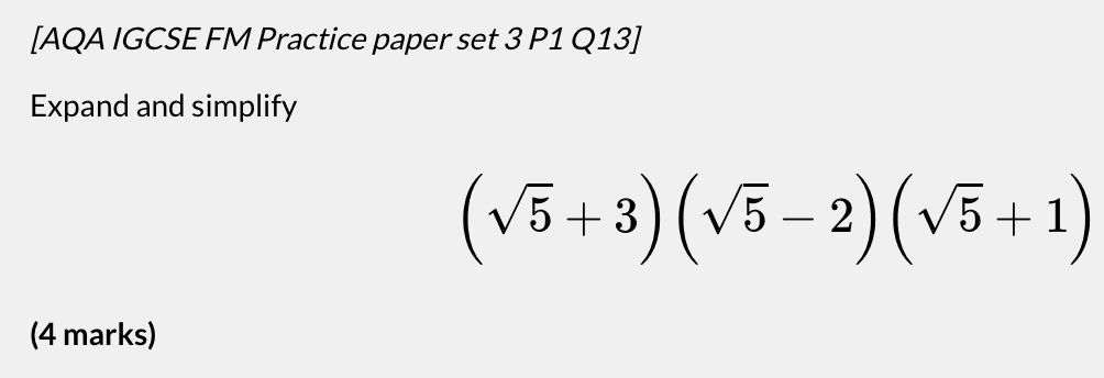 The next stage in this topic will be introducing binomial expansion, which allows us to expand brackets raised to any power. We won’t introduce that here, but we will look at some more difficult questions which will help us to be more flexible in our thinking as well as using our technical skills (I haven’t included the solutions for these):