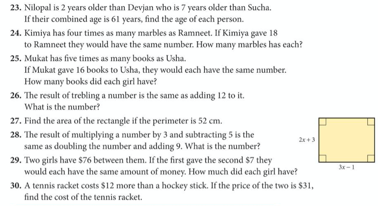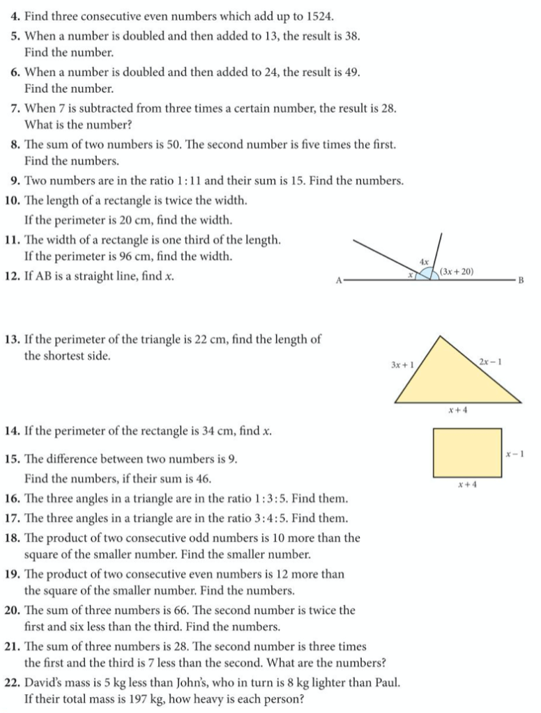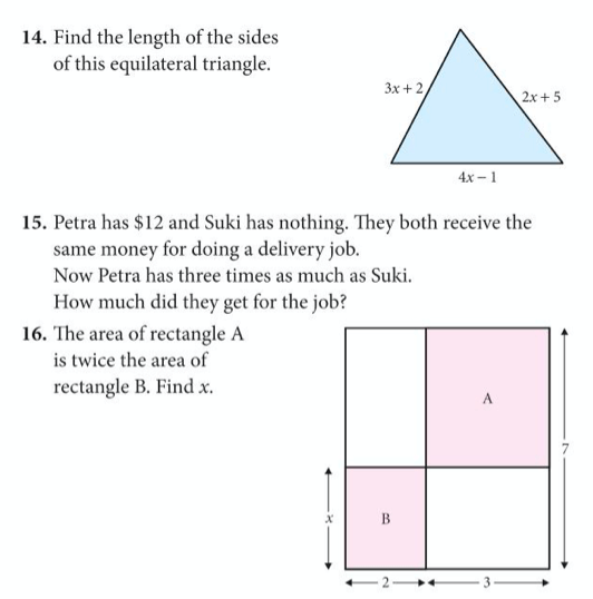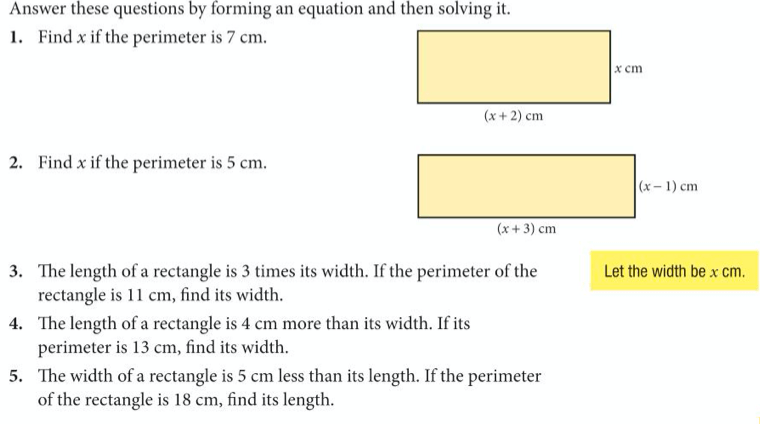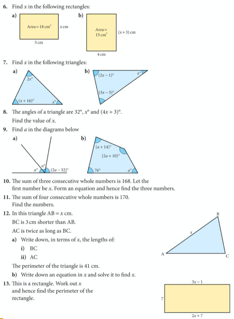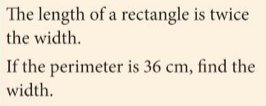 Although solving equations algebraically is lots of fun, the process wasn’t just invented as a game to play, but helps us to solve many problems, which can be expressed in words, or geometrically. Let’s try solving some of these.