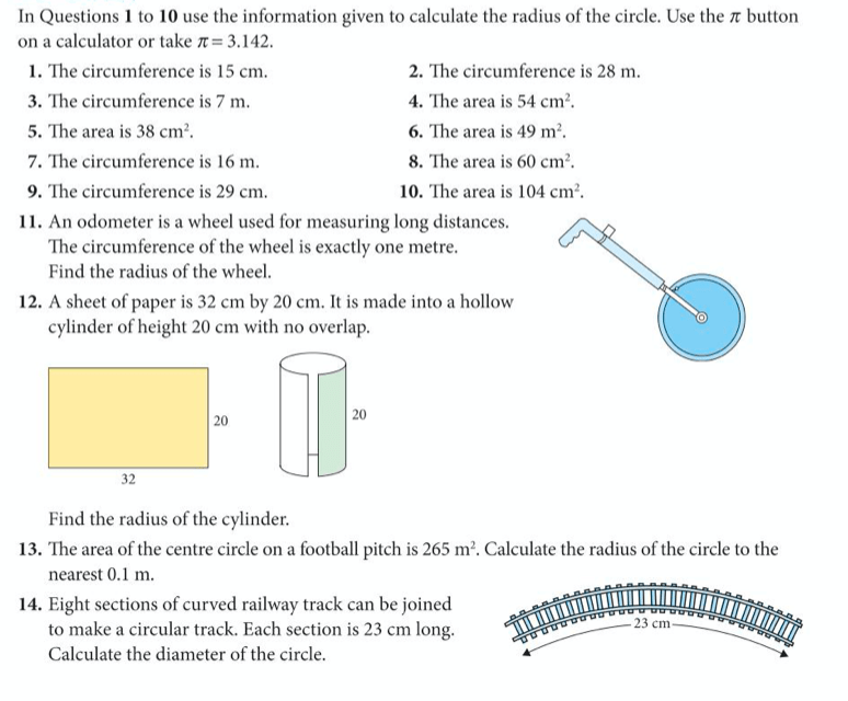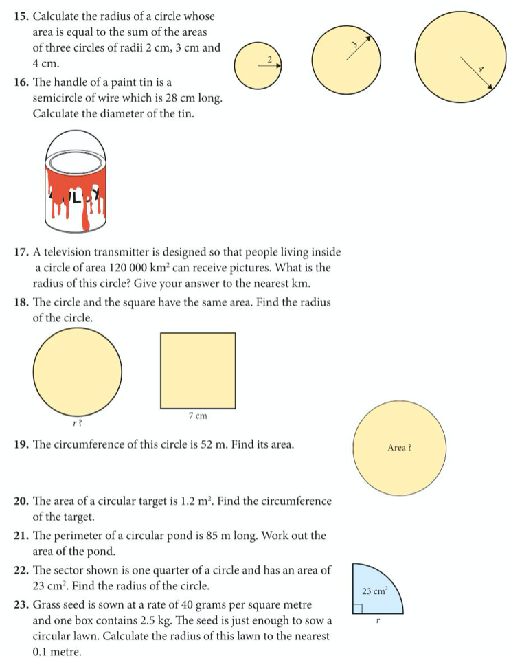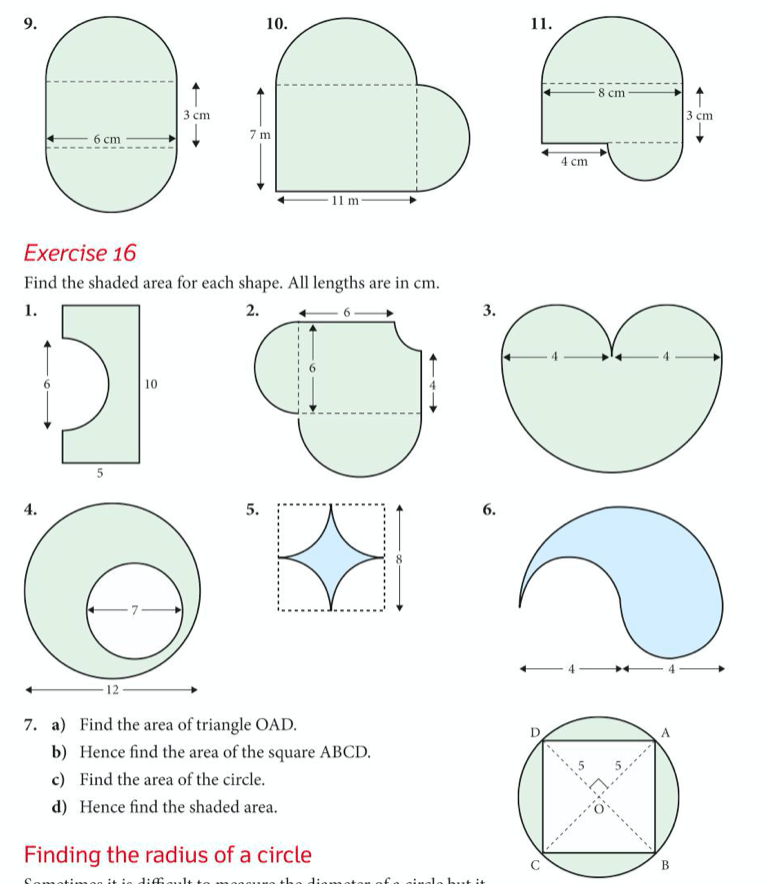 Now let’s use these formulas to find the area of more complicated shapes including parts of circles, and to find the radius when we know the circumference.
