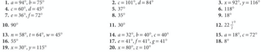(2.) 90º, (3.) 65º, (4.) 45º, (5.) 90º, (6.) e = 40º, f = 50º, (7.) g = 30º, (8.) h = 90º, i = 60º, (9.) j = 49º, (10.) 45º, (11.) l = 60º, m = 50º, (12.) n = 40º, (13.) 50º