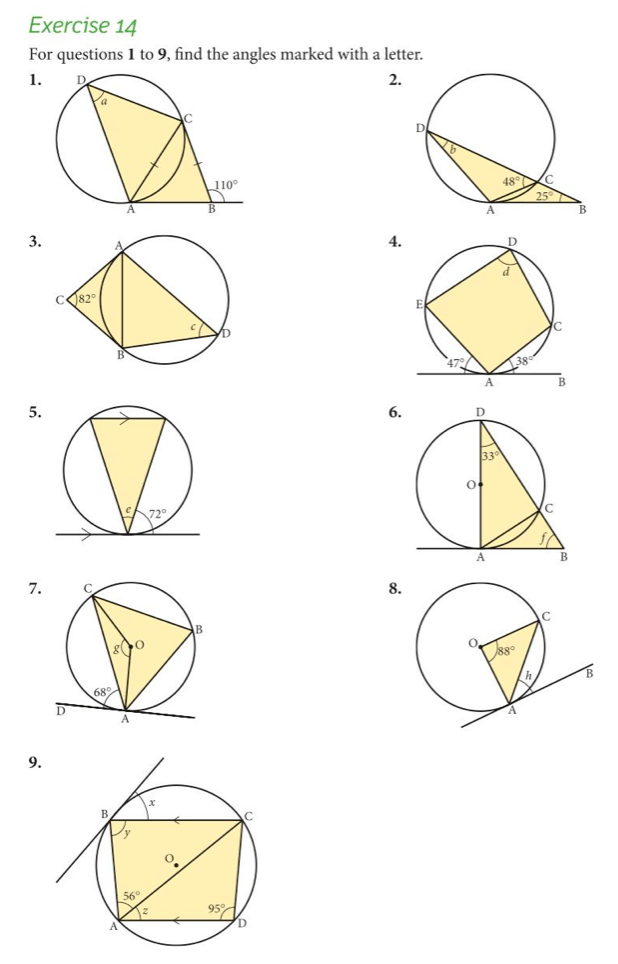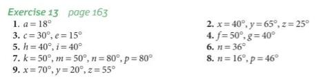 Let’s apply this knowledge to calculate the size of the angles marked with letters in exercise 12 on pages 161 to 162 of the extended textbook: